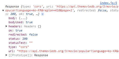그러니 영화 목록을 가져오는 get 함수를 실행 한 후 화면에 영화 목록을 생성하려면, 영화 목록을 생성하는 작업을 콜백 함수로 전달하여 영화 데이터를 받은 후 사용해야합니다. 콜백 함수로 받은 json을 출력해 보면 영화 정보가 담겨 있는 것을 확인할 수 있습니다.