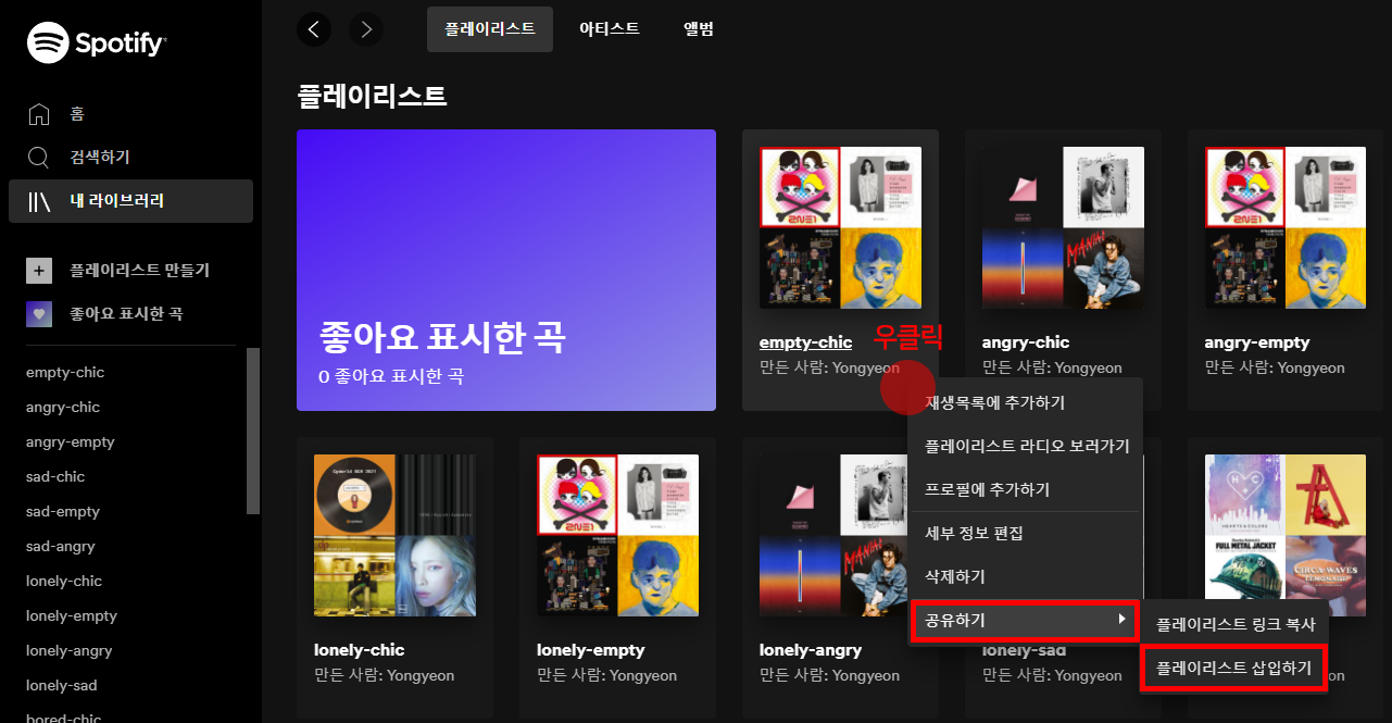 왼쪽 메뉴의 '플레이리스트 만들기'로 원하는 리스트를 만들고, '내 라이브러리'를 클릭하면 자신이 만든 플레이리스트를 볼 수 있습니다. 해당 리스트를 우클릭해서 '공유하기' > '플레이리스트 삽입하기'를 클릭합니다.
