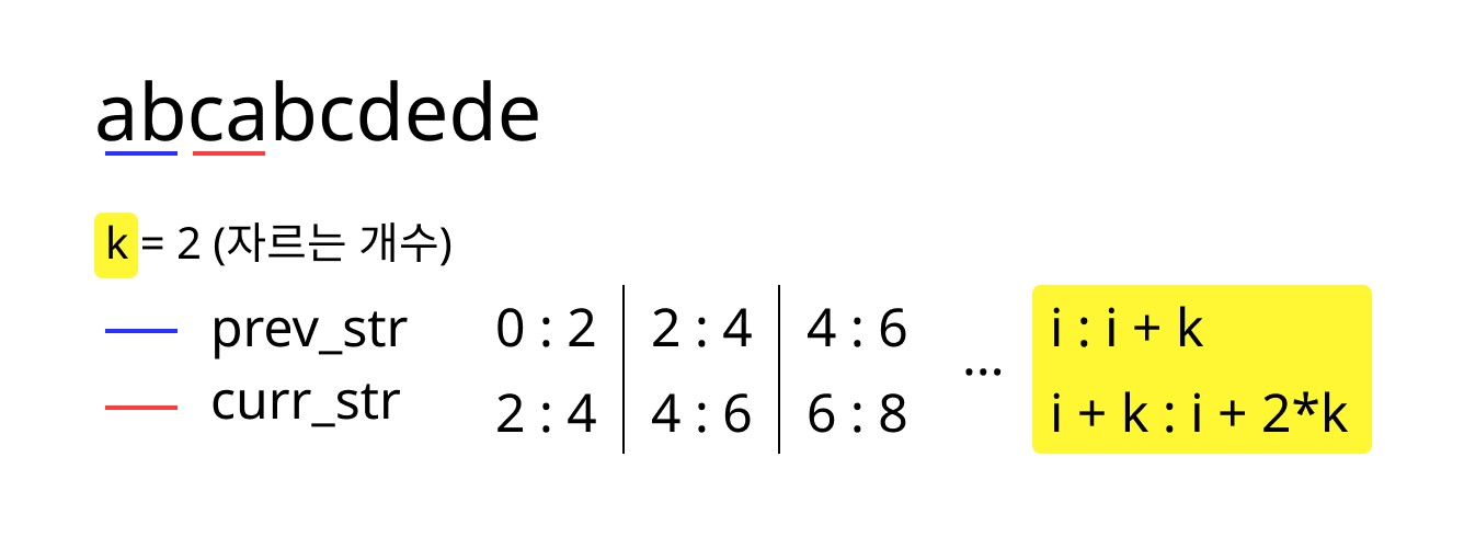 k개로 문자를 자를 때, 앞의 문자(prev_str)와 뒤의 문자(curr_str)의 index 값이 어떻게 변하는가?