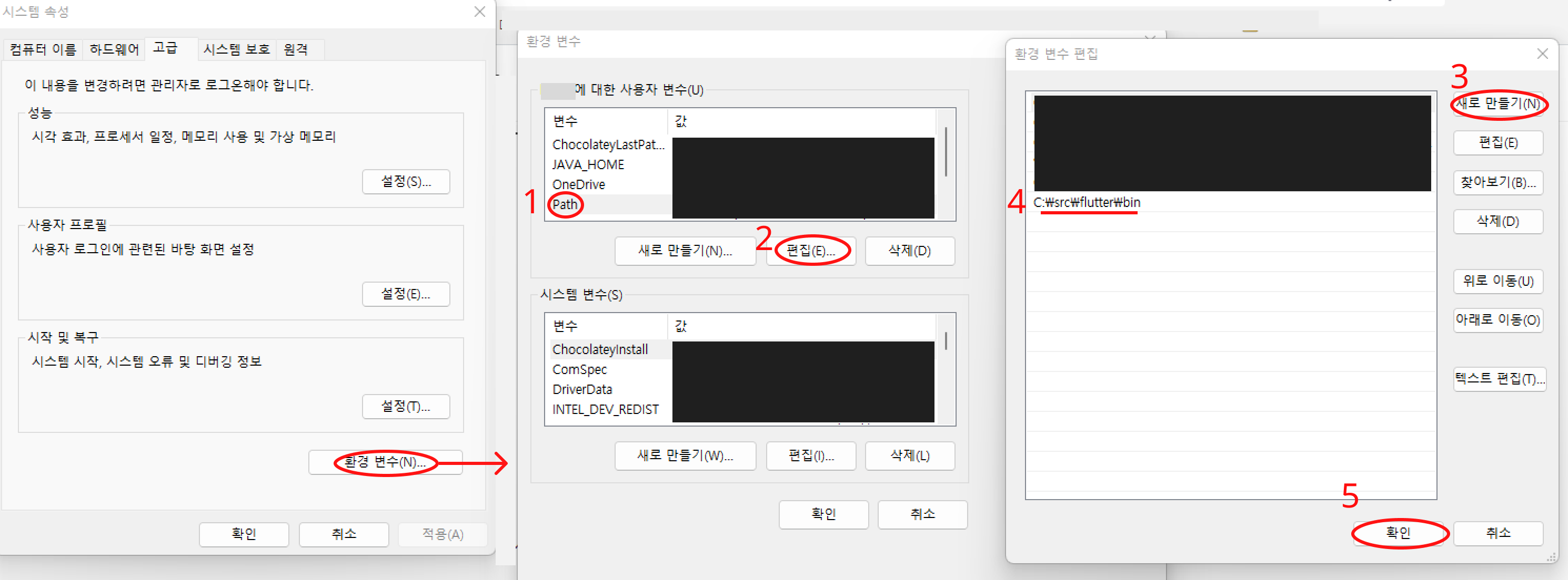를 순서대로 누른 다음 (저와 폴더 위치가 동일하다면) C:\src\flutter\bin 를 입력하고 저장합니다.