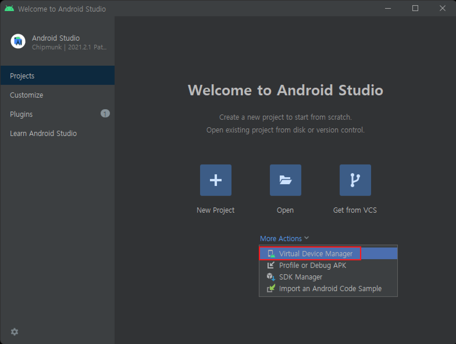 - 시작 화면에서 More Action > Virtual Device Manager 를 선택합니다.
