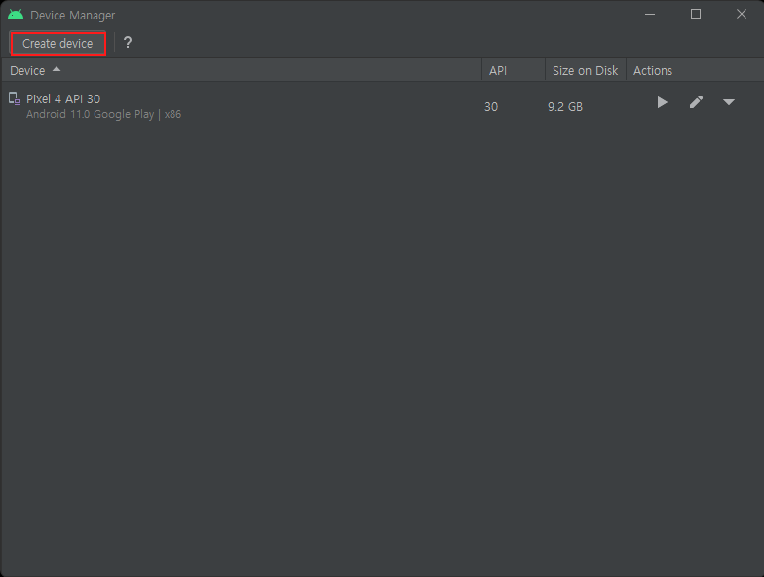 - 아래 device를 눌러 아까 설치한 emulator을 실행합니다.