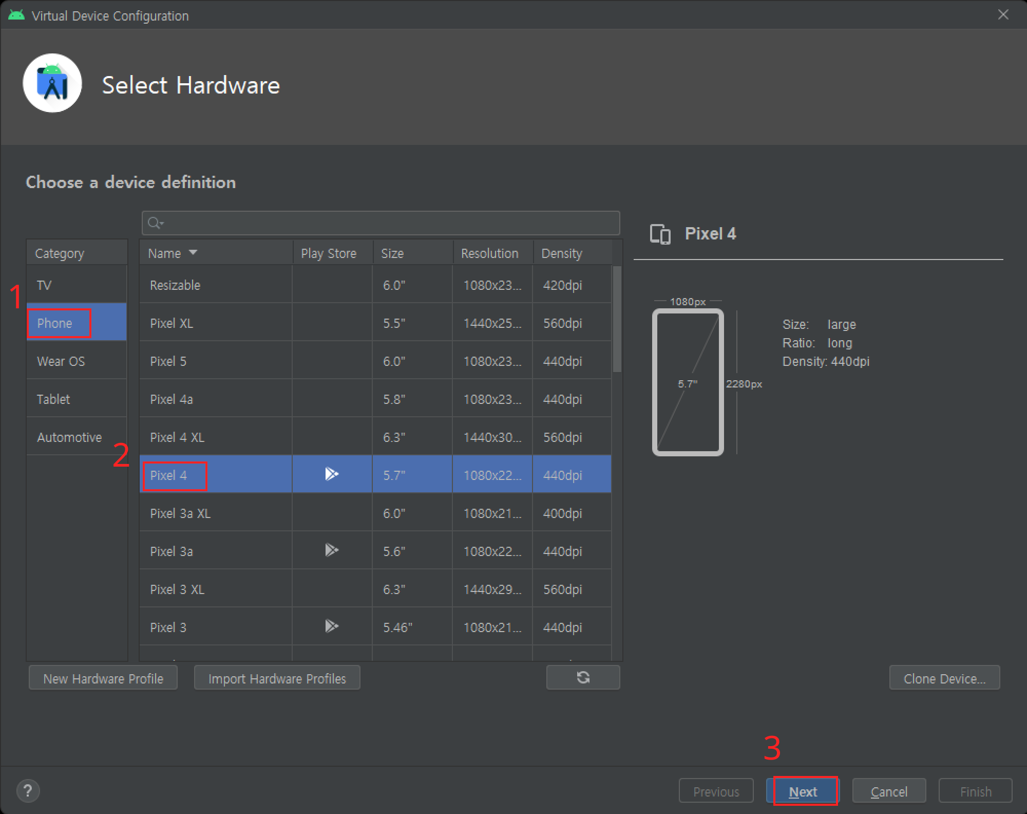 - 원하시는 걸 다운받으면 되는데 저는 Pixel 4를 선택했습니다.