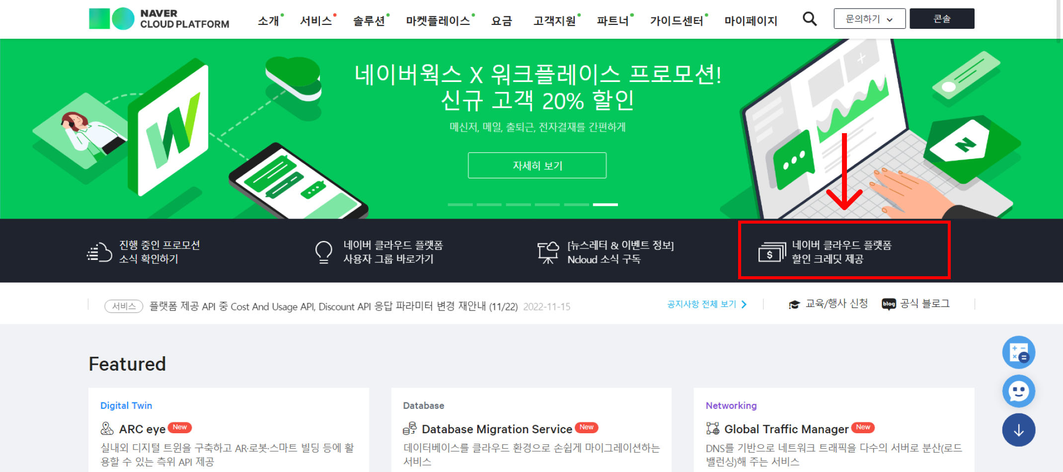 이벤트 중인 10만원 크레딧은 그냥 받을 수 있는 게 아니라, 본인 카드를 먼저 결제 수단으로 등록하면 신청하여 받을 수 있습니다. 이벤트는 아래 이미지처럼 '네이버 클라우드 플랫폼 할인 크레딧 제공'에서 확인하세요.