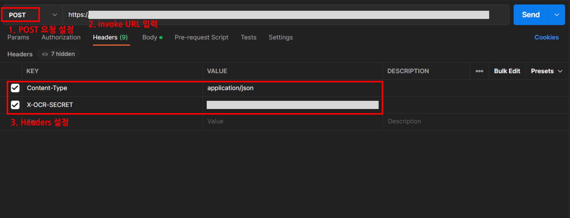 - 그 다음 Headers에 아래 사진처럼 Content-Type과 X-OCR-SECRET(OCR에서 받은 Secret Key)을 설정합니다.