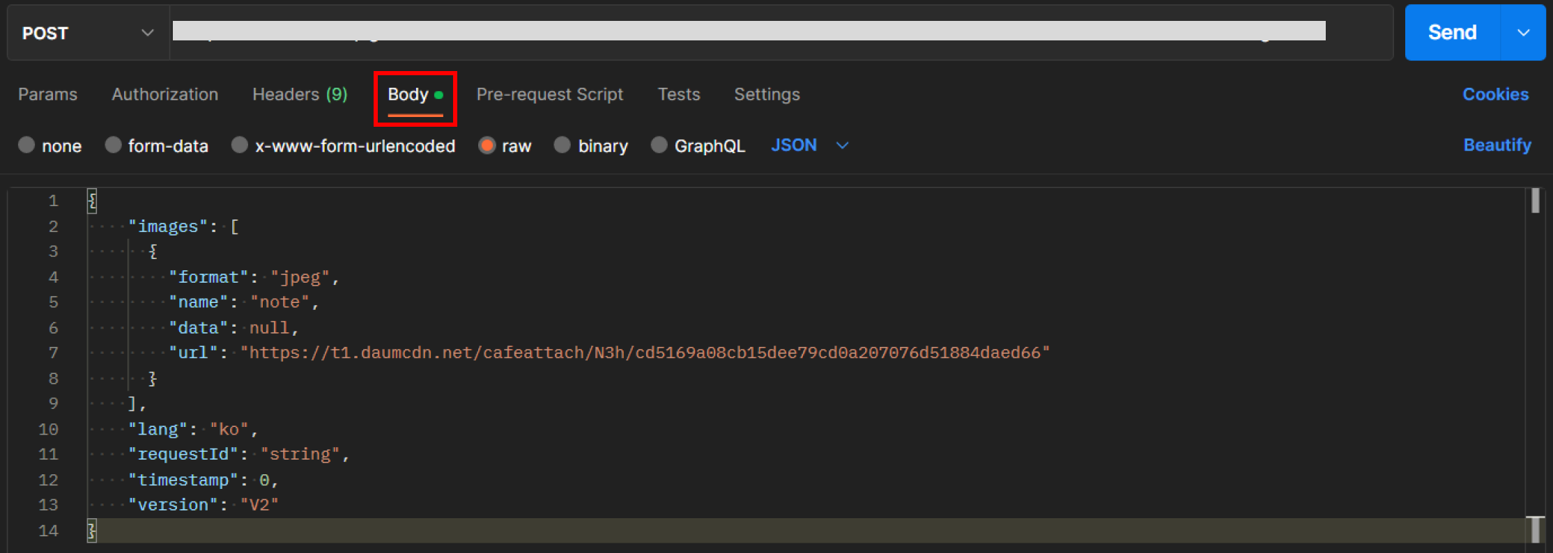 위 코드처럼 Body에 요청 JSON를 입력하고 Send를 눌러 요청을 보내면 응답이 옵니다. 응답을 성공적으로 받으면, 저희가 필요로 하는 텍스트 정보는 images.fields에 들어있습니다.