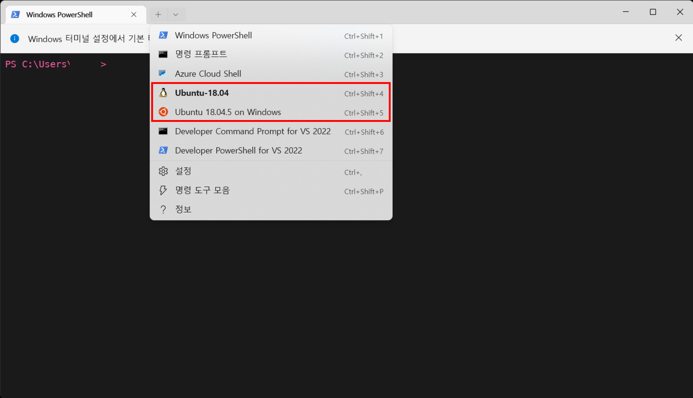 윈도우 터미널을 깔고 실행해보면 다음 이미지처럼 Ubuntu를 사용할 수 있습니다. 저는 윈도우에 설치한 Ubuntu와 wsl로 설정한 Ubuntu가 둘 다 있는데, 아마 따로 Ubuntu를 설치해서 그런 것 같습니다. 둘 중 하나로 사용하시면 됩니다.