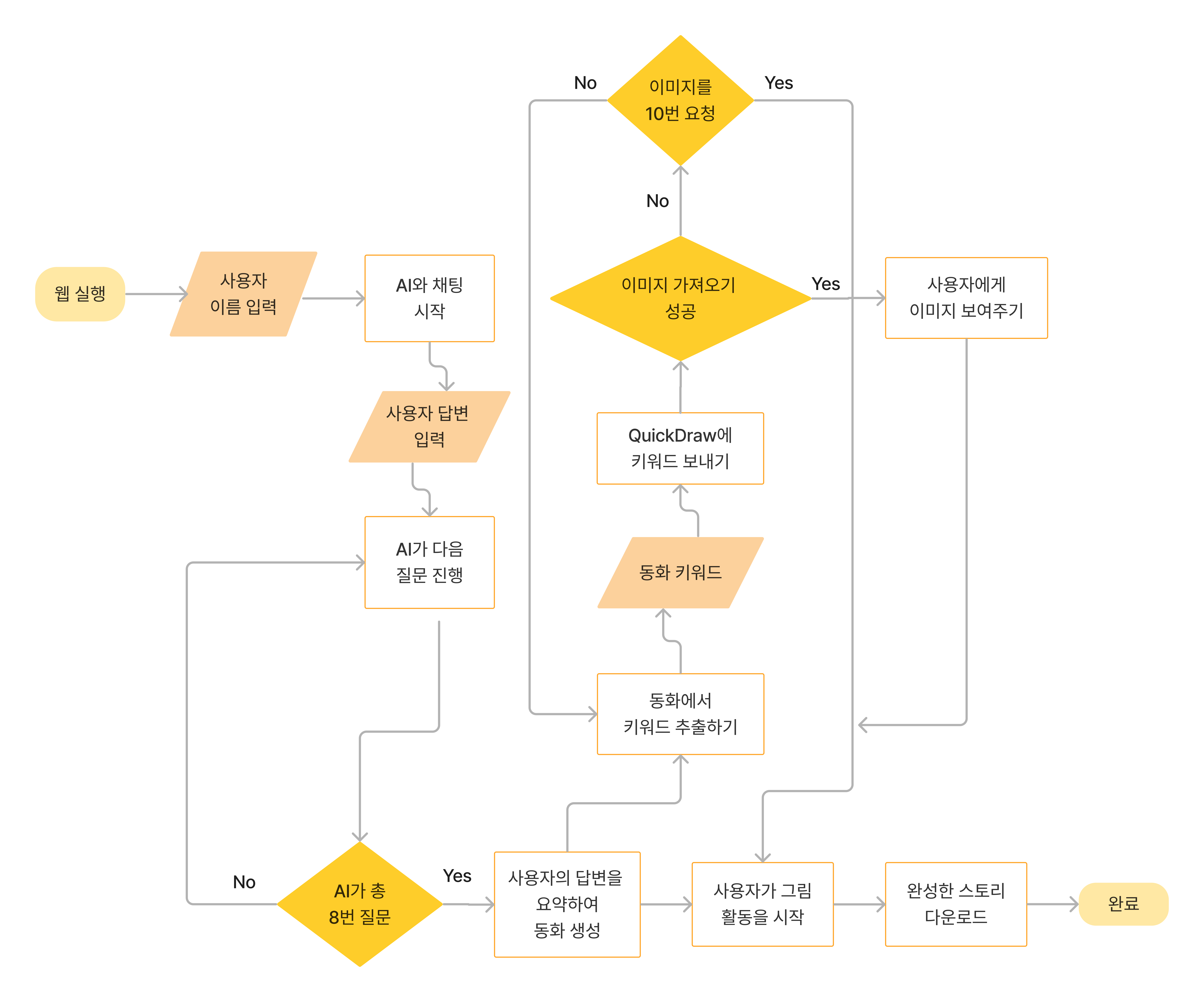 사용자가 quickdraw 그림을 참고해서 그림 활동을 모두 마치면, 글 창작 단계에서 생성한 글과 사용자의 그림을 합쳐 한 페이지의 동화로 만듭니다. 사용자는 이 동화를 이미지로 저장할 수 있습니다. 위의 과정을 나타난 플로우차트는 아래와 같습니다.