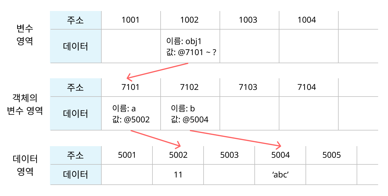 - 참조형 데이터인 객체는 프로퍼티 값을 변경하면 기존 변수 영역에 저장된 객체 주소가 그대로 남아있으면서, 객체의 변수 영역에 새로운 데이터 주소가 저장됩니다.