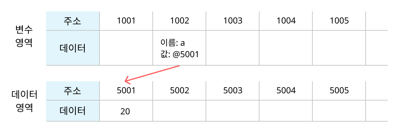 두 가지 방법으로 a라는 변수에 20이라는 데이터를 할당할 수 있습니다. 그러면 메모리에서 먼저 변수 a의 공간과 데이터 20의 공간을 만듭니다. 그 다음 a 변수의 값에 데이터 20 공간의 주소를 저장합니다.