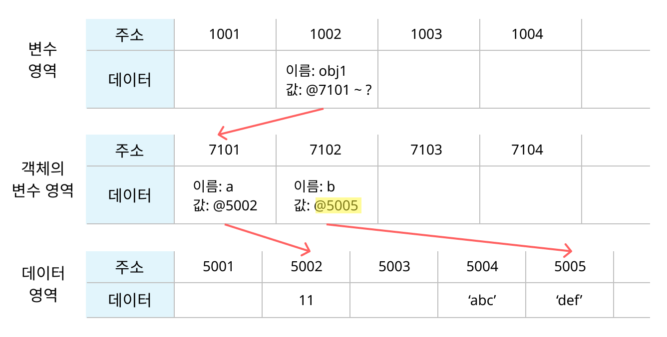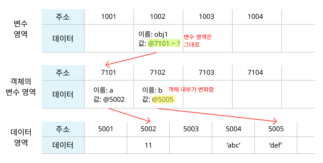 그러면 이전 기본형 데이터와 마찬가지로 객체의 변수 영역에 새로운 주소를 저장합니다.